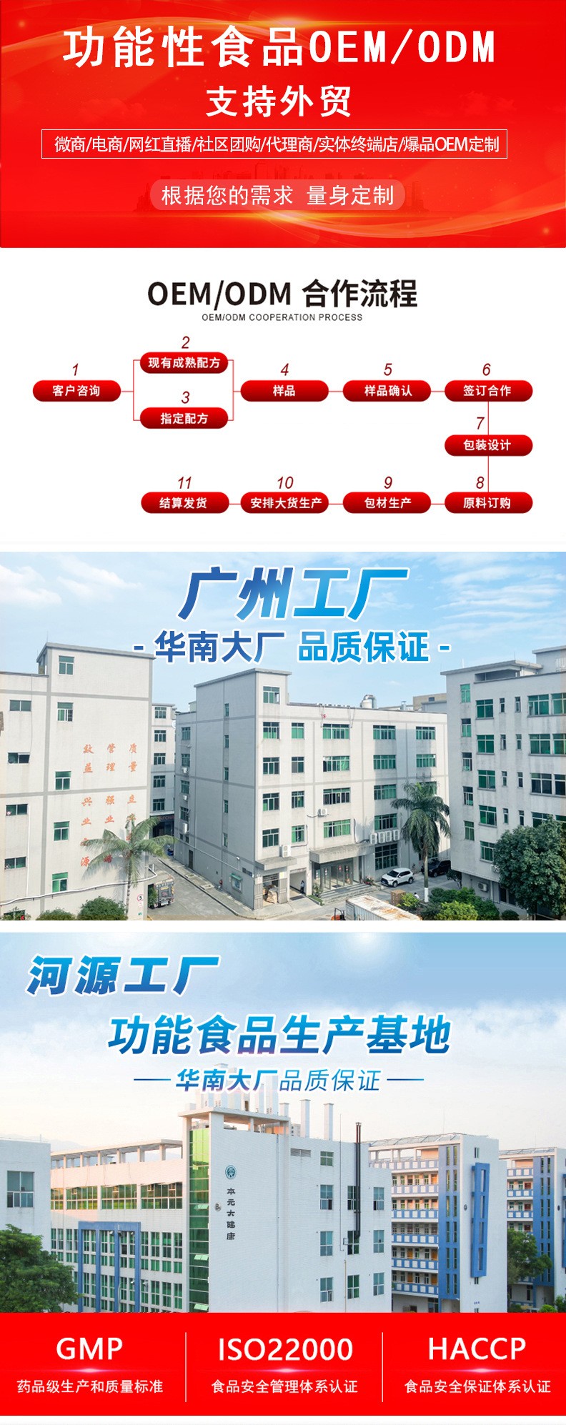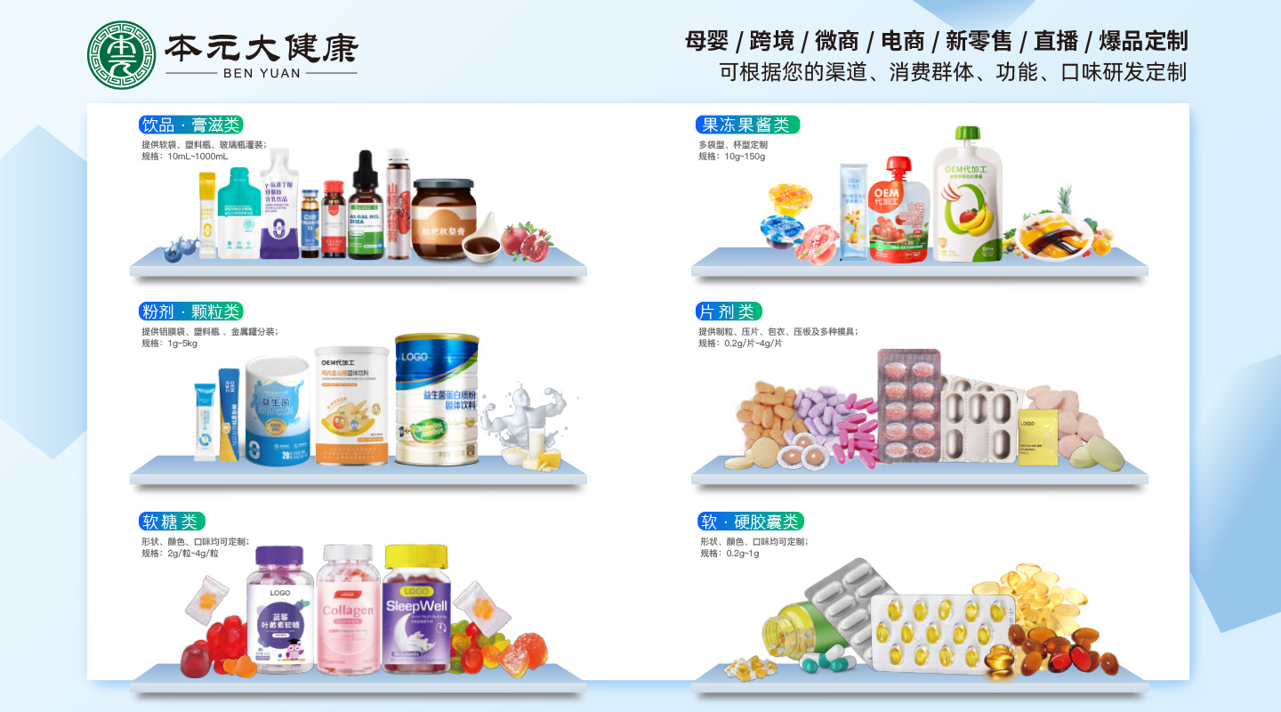 集團(tuán)公司設(shè)有固體車間、液體車間、益生菌專用車間、果蔬發(fā)酵車間。是一家專業(yè)從事食品、功能食品、保健品OEM、ODM供應(yīng)商,開發(fā)提供各種食品專利配方、藥食同源配方、功能性食品配方。針對美容院線、微商團(tuán)隊(duì)、直銷團(tuán)隊(duì)、電商平臺、抖音商戶等各種渠道開發(fā)針對性產(chǎn)品,保證產(chǎn)品開發(fā)技術(shù)的實(shí)時性與獨(dú)創(chuàng)性,公司可以根據(jù)客戶需求提供專業(yè)配方,并協(xié)助客戶申報(bào)專利。
