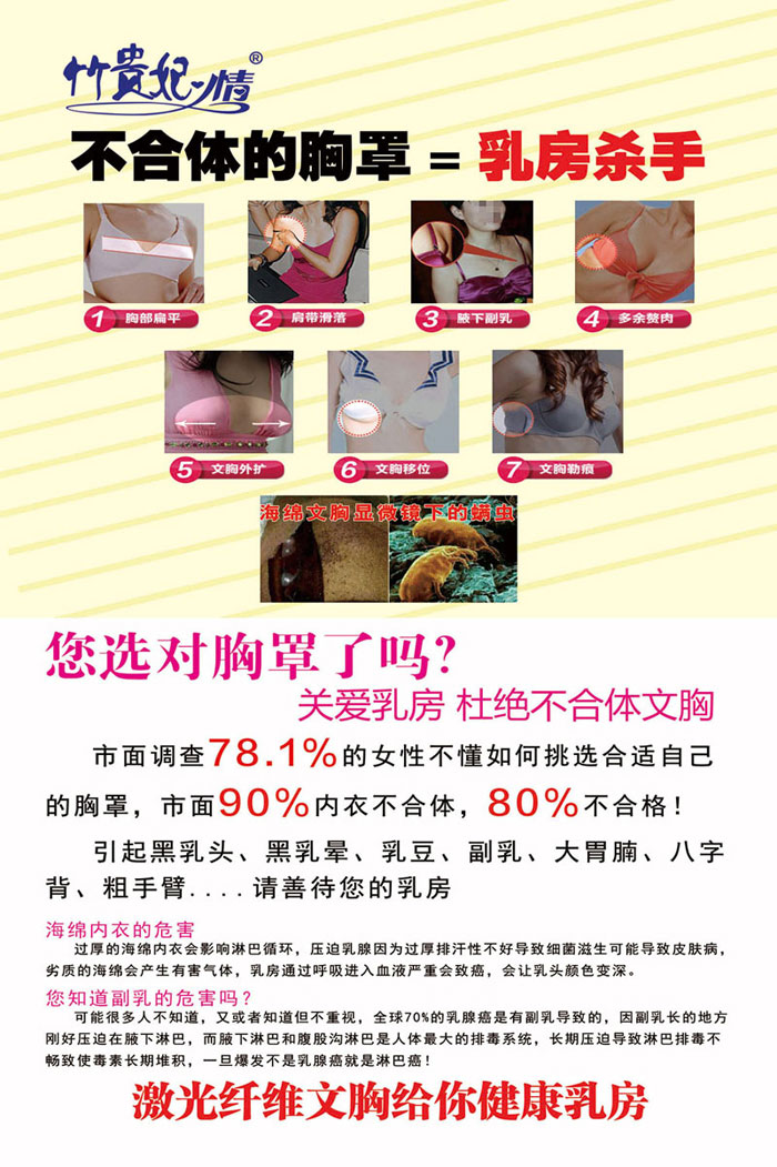 品牌名稱:竹貴妃情 主營(yíng)產(chǎn)品:竹貴妃情激光纖維文胸,竹貴妃情能量褲 品牌特色:工藝升級(jí),親膚舒適