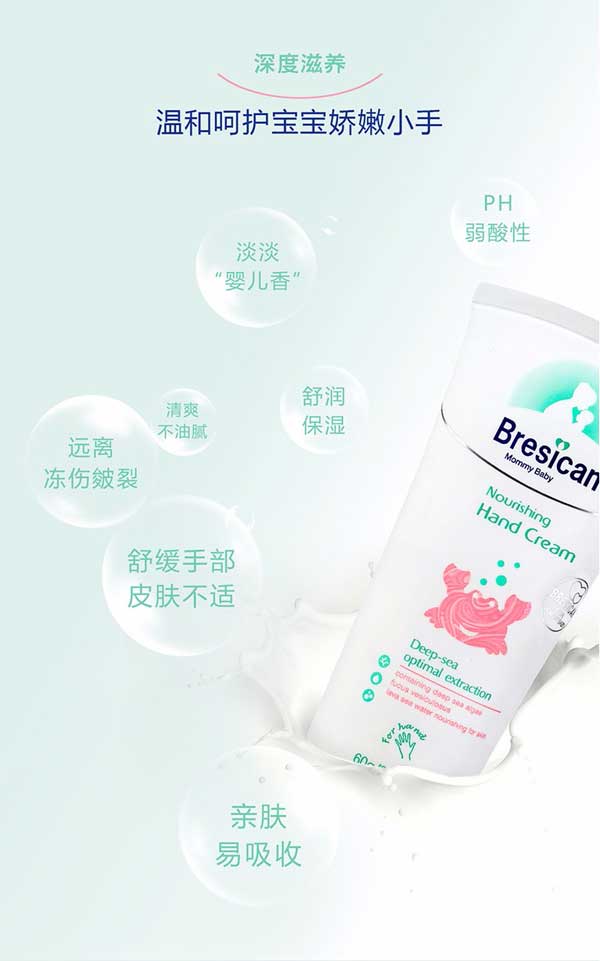 Bresican貝施康滋養(yǎng)護(hù)手霜是 “深海優(yōu)萃”系列的護(hù)手產(chǎn)品,根據(jù)yinge特殊肌膚PH特點(diǎn)研制,從深海中萃取自然純凈成分,配方做到純正安全,讓媽媽心安!