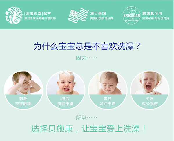 貝施康柔凈洗發(fā)沐浴2合1是 “深海優(yōu)萃”系列的王牌產(chǎn)品,根據(jù)yinge特殊肌膚PH特點(diǎn)研制,從深海中萃取自然純凈成分,配方做到純正安全,讓媽媽心安!