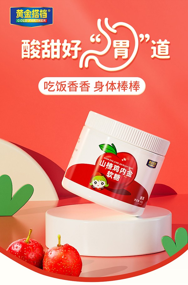 黃金搭檔山楂雞內(nèi)金軟糖,植物草本配方,綠色安全!精選果實飽滿的優(yōu)質(zhì)山楂為原料,更添加雞內(nèi)金提取物、維生素C等,科學配比,美味營養(yǎng)!以麥芽糖醇代替蔗糖,降低甜度,呵護幼齒!顆顆獨立包裝,干凈衛(wèi)生易攜帶,拆袋即食,酸甜口感,拯救“小飯渣”,讓孩子“食”力全開,茁壯成長!