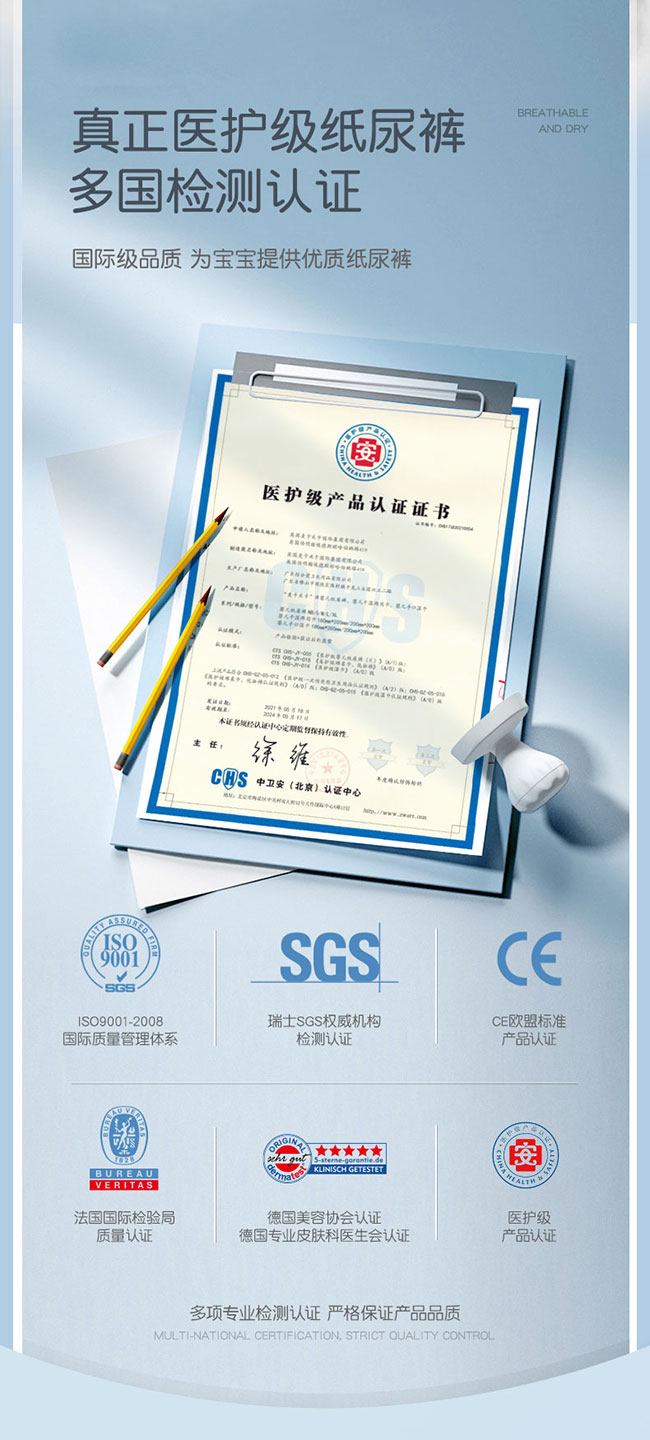 它的 “硬核” 首先藏在認(rèn)證里。作為醫(yī)護(hù)級(jí)紙尿褲,它通過了多國檢測認(rèn)證,從原料到生產(chǎn)都經(jīng)過嚴(yán)格把控,給寶寶的守護(hù)多了一層專業(yè)保障,寶媽選的時(shí)候不用再反復(fù)對(duì)比成分表,省心又安心。