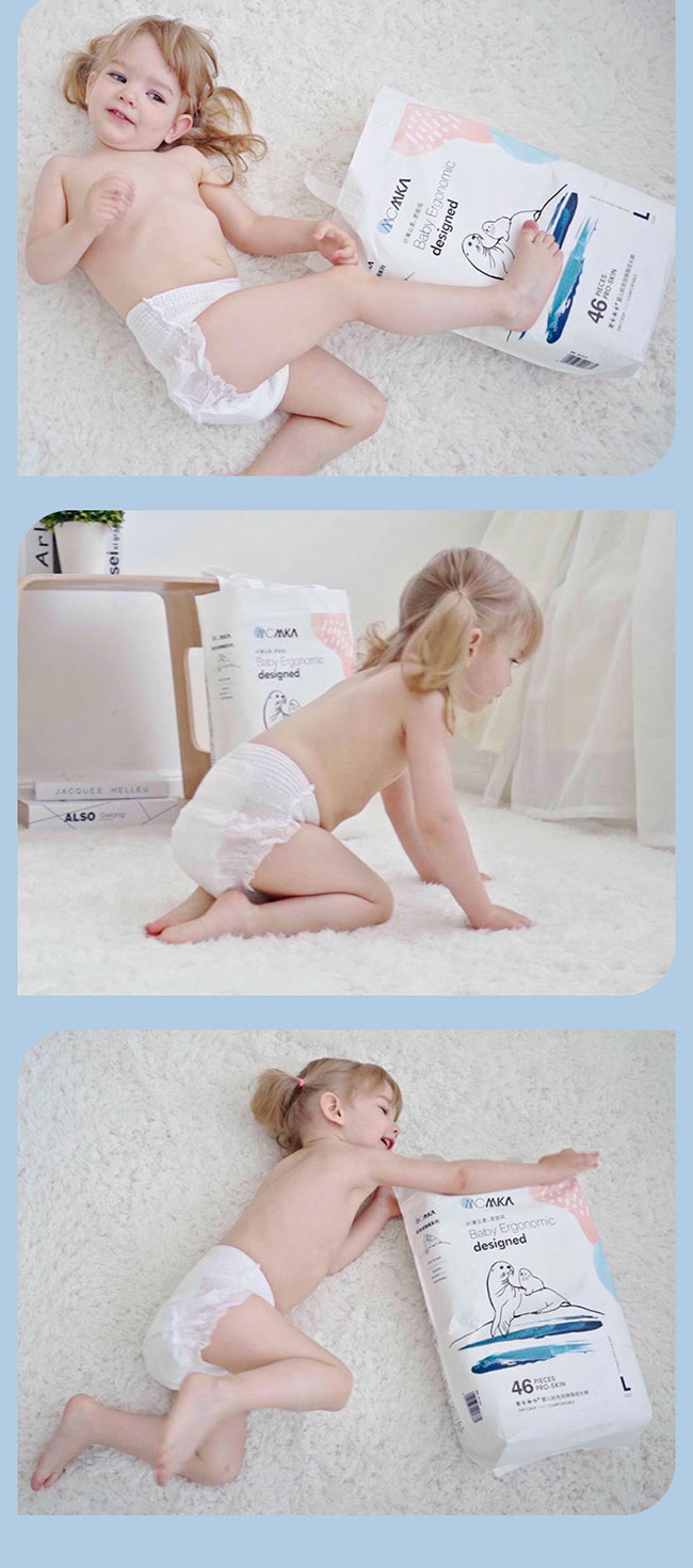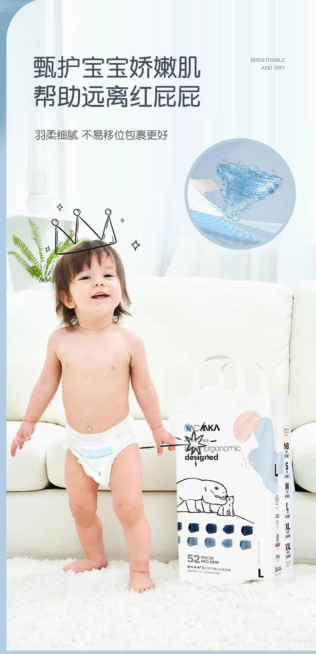 麥卡米卡嬰兒空氣感U芯紙尿褲,醫(yī)護(hù)級(jí)紙尿褲,多國檢測認(rèn)證。羽毛般輕薄,薄至0.1cm,無感般穿著,透氣舒適,自有呼吸不悶熱;臺(tái)灣進(jìn)口面層,梅花打孔設(shè)計(jì),先進(jìn)單層水刺布技術(shù),更輕薄,更柔軟親膚,讓寶寶的小屁屁更干爽,更舒服。日本進(jìn)口芯體,不易起坨斷層,自主獨(dú)特吸水系統(tǒng),海量瞬吸;全方位立體打孔,底膜25000個(gè)透氣孔,迅速散熱排濕,甄護(hù)寶寶嬌嫩肌膚,遠(yuǎn)離紅屁屁;羽柔細(xì)膩,不易移位,包裹更好;雙層防側(cè)漏,安睡一整晚。