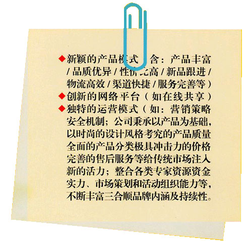 2007 年,三合順制定新時(shí)期發(fā)展戰(zhàn)略,以“童悅”作為公司自有主打品牌,秉承“一切為了孩子”這一核心理念,橫跨自行車(chē)和兒童用品兩大行業(yè),專(zhuān)業(yè)從事系列化兒童用品創(chuàng)新研發(fā)、組織生產(chǎn)、外貿(mào)內(nèi)銷(xiāo)和文化服務(wù),建立覆蓋“供—產(chǎn)—儲(chǔ)—運(yùn)—展—銷(xiāo)—交—服”供應(yīng)鏈系統(tǒng)解決方案的強(qiáng)勢(shì)品牌。同時(shí),三合順與北京中卡世紀(jì)動(dòng)漫文化傳媒有限公司達(dá)成戰(zhàn)略合作,制作品牌動(dòng)畫(huà)片,全程助力“童悅”品牌形象的創(chuàng)建和推廣。