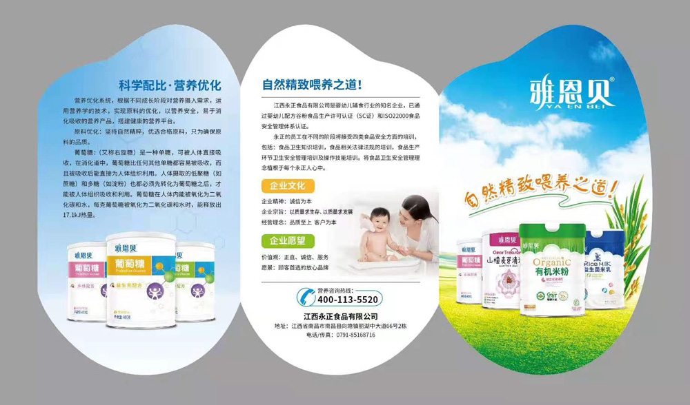 “雅恩貝”是江西永正食品有限公司旗下主打品牌,公司成立于2016年5月26日,是國家制定新政后的新型嬰幼兒輔食企業(yè)。企業(yè)已經(jīng)通過嬰幼兒配方谷粉食品生產(chǎn)許可證(證號:SC10636012111666)和ISO22000食品安全體系認(rèn)證。本著“專業(yè)執(zhí)著,精益求精”的工作原則,秉承“品質(zhì)至上,客戶為本”經(jīng)營理念,研制生產(chǎn)了適合嬰幼兒健康營養(yǎng)需要的米粉類,清火寶類,葡萄糖類等系列產(chǎn)品。