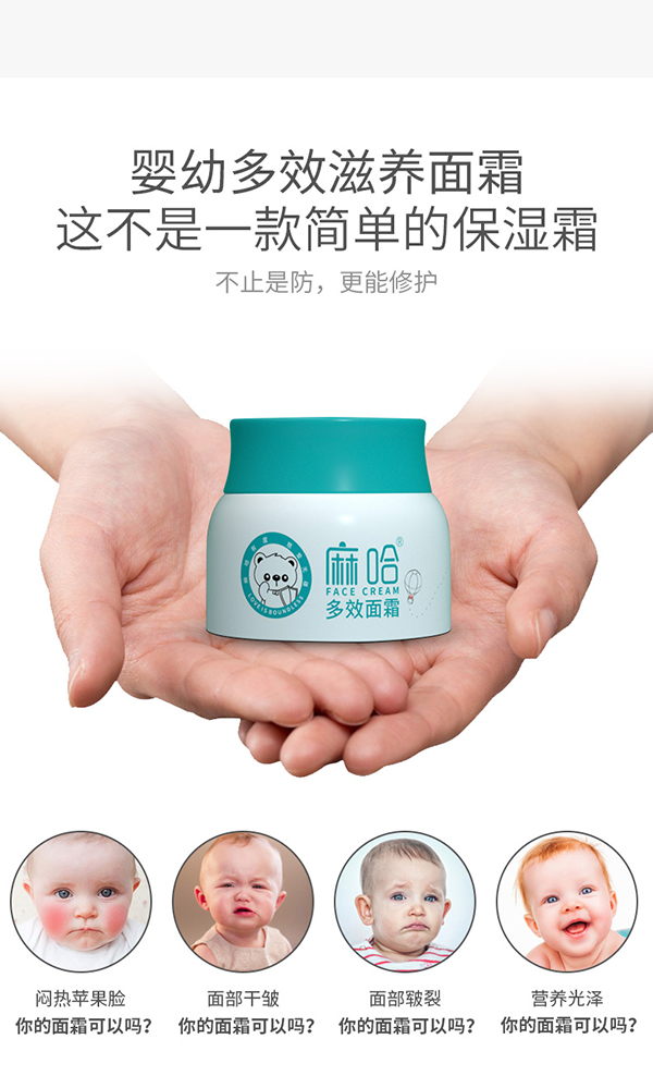 麻哈多效面霜,針對嬰幼小臉肌膚秋冬季節(jié)干燥、皴裂、粗糙以有效滋潤保濕為前提,實現從內在肌膚細胞鎖水而改變小臉問題,秋冬必備之品,舒緩、保濕、滋潤、防裂等,多重呵護。