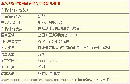 “美好小棉襖”,一個(gè)育嬰業(yè)的經(jīng)典品牌正在迅速崛起和擴(kuò)張。輝煌的事業(yè)愿與大家分享,強(qiáng)強(qiáng)聯(lián)合,力量不可超越。在全國(guó)市場(chǎng)穩(wěn)步拓展之際,美好孕嬰用品有限公司誠(chéng)邀有識(shí)之士共同描繪財(cái)富藍(lán)圖,演繹精彩的價(jià)值人生。