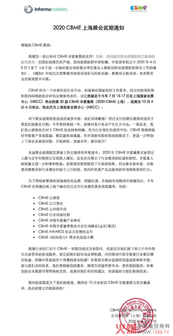 受疫情影響,今日CBME官方發(fā)聲明確定2020孕嬰童會展延期,決定將原定于今年7月15-17日在上海國家會展中心(NECC)舉辦的第20屆CBME孕嬰童展(2020CBME上海),延期至10月4日-6日舉辦,地點仍為上海國家會展中心(NECC)。
