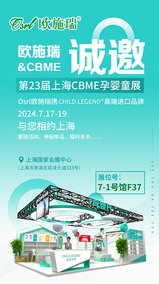 作為母嬰營養(yǎng)品領(lǐng)域的優(yōu)秀品牌,歐施瑞將攜童年傳奇高端進(jìn)口品牌重磅亮相2024上海CBME孕嬰童展,展位號(hào):7-1F37,在此,誠邀您蒞臨參觀,溝通交流!